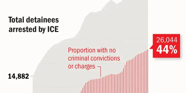 The data illustrates Trump’s commitment to mass deportations. The number of people arrested and detained by ICE who have no criminal convictions or pending charges has skyrocketed from 945, or 6% of all arrests, last January, to 26,044, or 44%, last month, according to data published by the Transactional Records Access Clearinghouse at Syracuse University. That spike reflects a dramatic transformation in how the country’s immigration system treats people who are in the country unlawfully, but have no criminal convictions or pending criminal charges.