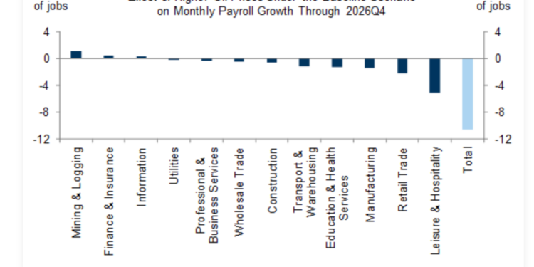 The damage isn’t distributed evenly. Goldman’s sector-level analysis points to leisure and hospitality as the single hardest-hit industry, accounting for roughly 5,000 lost jobs per month, with retail trade shedding another 2,000. The logic is straightforward: when energy prices surge, consumers cut back on discretionary spending first — skipping vacations, eating out less, and trimming shopping trips — while continuing to pay for essentials like healthcare and housing. The oil shock, in other words, hits the working-class service economy well before it touches more insulated sectors.