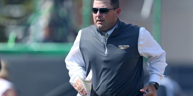 Sep 16, 2023; Hattiesburg, Mississippi, USA; Southern Miss Golden Eagles head coach Will Hall runs onto the field before their game against the Tulane Green Wave at M.M. Roberts Stadium. Mandatory Credit: Chuck Cook-Imagn Images