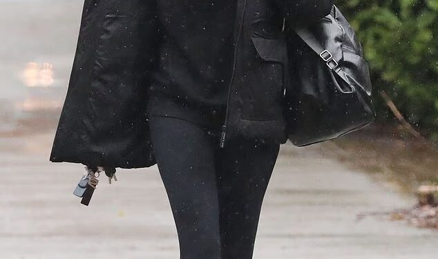 The I’m A Celeb star wore a black padded parka jacket over a black hoodie with skintight leggings and covered her eyes with black sunglasses
