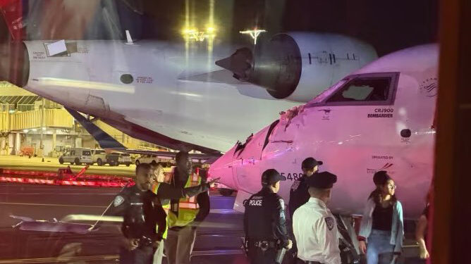 TWO Delta passenger planes collided in a terrifying smash at New York’s LaGuardia Airport – ripping the wing off one jet and injuring a flight attendant.