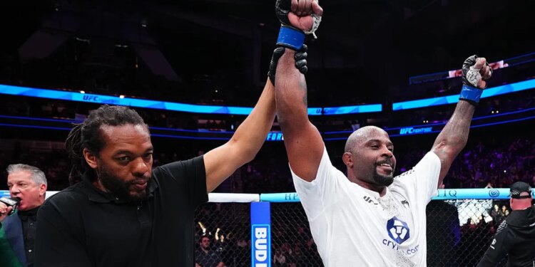 Tyrell Fortune reacts after a victory against Marcin Tybura during the UFC Fight Night event at Climate Pledge Arena on March 28, 2026, in Seattle. (Jeff Bottari/Zuffa LLC)