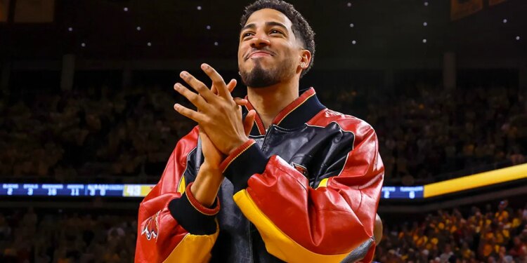 Former Iowa State guard and Olympic gold medalist Tyrese Haliburton, who plays for the Indiana Pacers, was honored with a halftime ceremony March 1, 2025, at Hilton Coliseum in Ames, Iowa. (David K Purdy/Getty Images)