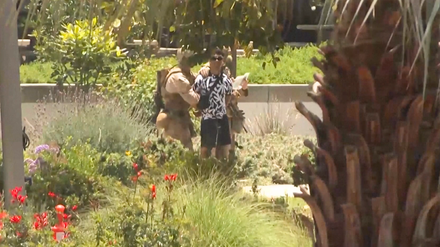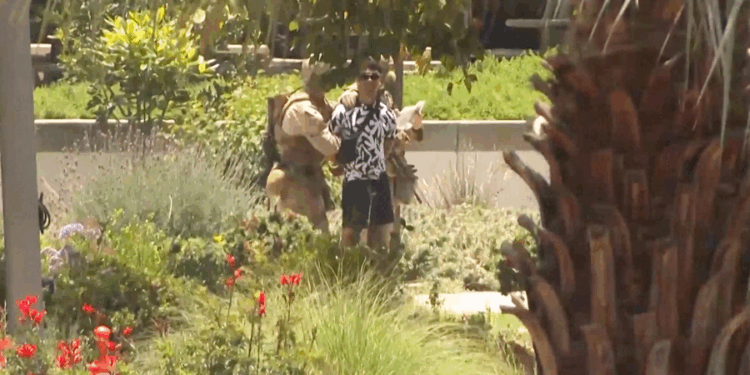 Hours after their highly anticipated arrival in Los Angeles, U.S. Marines were seen detaining a man next to the Federal Building in Westwood on Friday evening.
