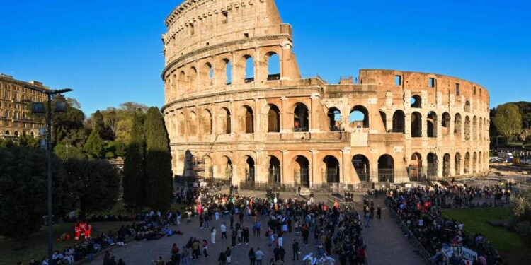 • A general view shows people gathering at the Colosseum monument in Rome on April 7, 2023, prior to the Way of the Cross (Via Crucis) prayer service as part of celebrations of the Holy Week.(Photo by Andreas Solaro/AFP via Getty Images)