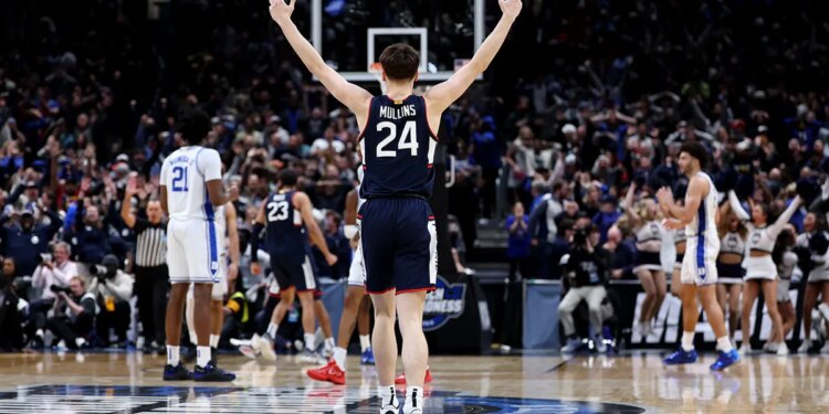 Braylon Mullins (24) of the UConn Huskies celebrates after shooting the game-winning 3-point basket during the second half against the Duke Blue Devils in the Elite Eight of the 2026 NCAA Tournament at Capital One Arena March 29, 2026, in Washington, D.C. (Emilee Chinn/Getty Images)