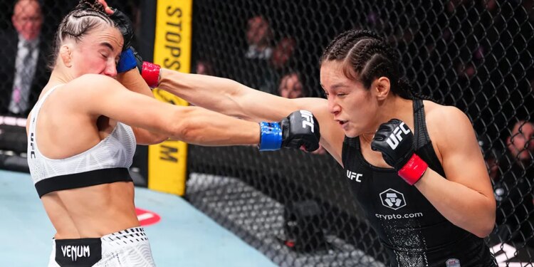 Alexa Grasso of Mexico punches Maycee Barber in a flyweight fight during the UFC Fight Night event at Climate Pledge Arena on March 28, 2026 in Seattle, Washington. (Jeff Bottari/Zuffa LLC)