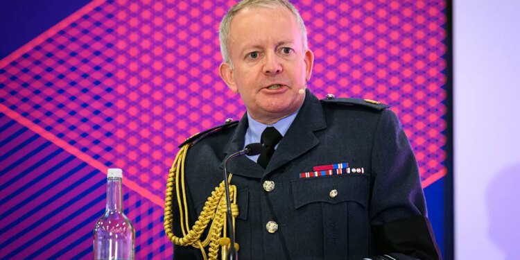 Chief of the Defence Staff at the Ministry of Defence Air Chief Marshal Sir Richard Knighton makes his keynote address on day two of the Defence and Security Equipment International (DSEI) on Sept. 10, 2025 in London, England. ( Leon Neal/Getty Images)