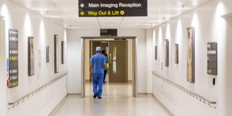 A staff member walks through a corridor inside a National Health Service hospital in the U.K. (Chris J. Ratcliffe/Bloomberg via Getty Images)