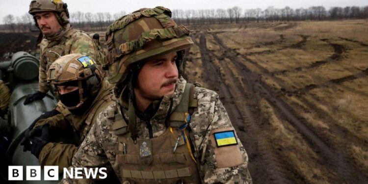 Getty Images Ukrainian soldiers in full battle dress sit on a cannon in a muddy field.  Getty Images