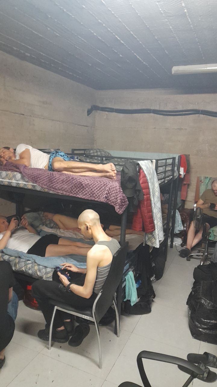 Ukrainian detainees wait in an underground holding area at the Russia-Georgia border, where men sleep in shifts due to the lack of beds [Courtesy of Nikolai Lopata]