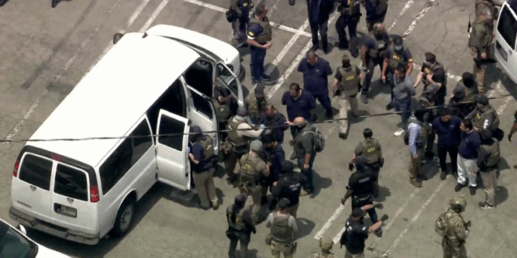 Federal agents load detainees into a vehicle following an immigration enforcement operation in downtown Los Angeles on June 6, 2025. (KTLA)