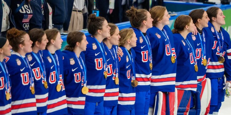 Team USA sings the national anthem with the gold medal at the winners ceremony after the women’s ice hockey gold medal game between the U.S. and Canada at Milano Santagiulia Ice Hockey Arena during the Milan Cortina 2026 Winter Olympic games Feb. 19, 2026, in Milan, Italy. (EyesWideOpen/Getty Images)