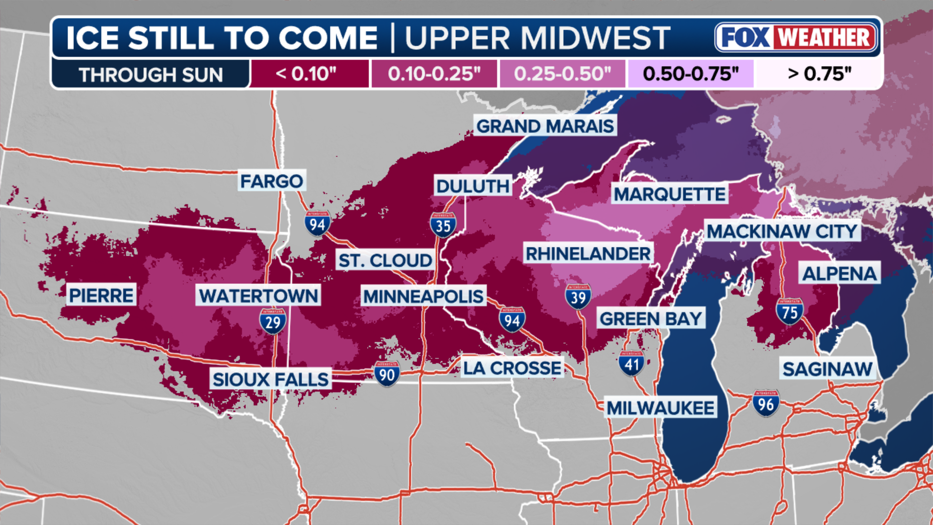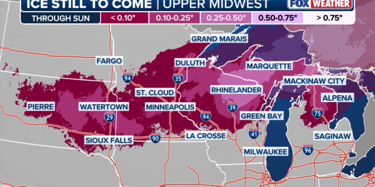 This graphic shows the ice accumulations in the Midwest until Sunday.