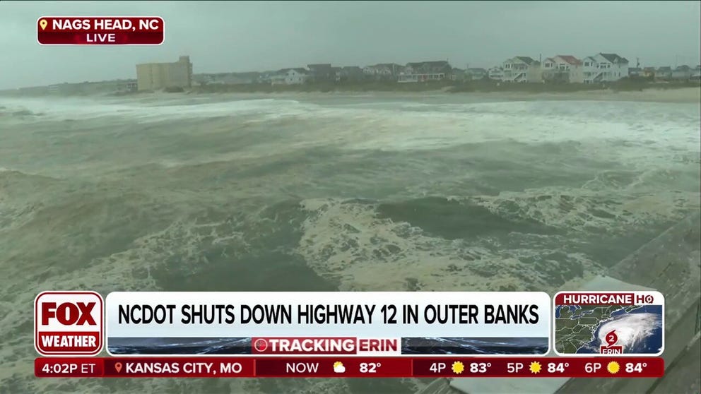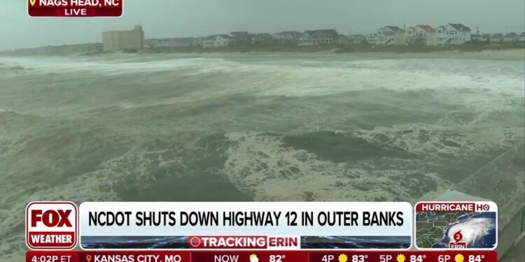 Erin, which reached Category 5 intensity while north of the Caribbean, came within about 200 miles of North Carolina’s Outer Banks on Thursday, causing overwash to swamp roadways and erode protective dunes.