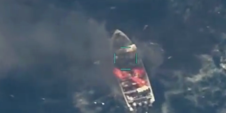 A grainy video clip released with the statement shows a stationary boat with outboard engines and what appear to be floats from fishing nets nearby. The boat comes under attack from the air and explodes into flames.