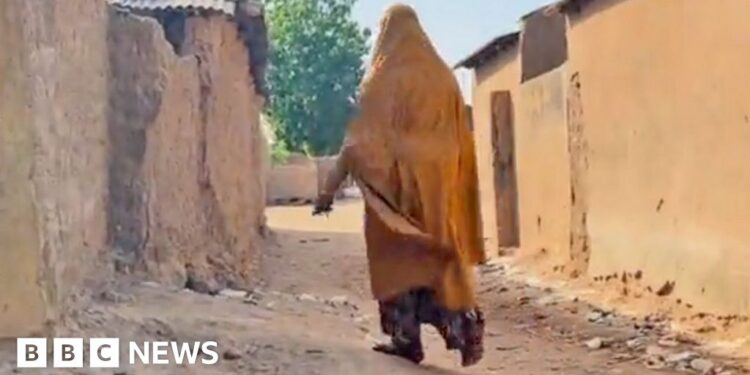 Gift Ufuoma/BBC A woman wearing a mustard-coloured robe, seen from behind, walking through a  street in Nukuru with mud-walled buildings on either side.Gift Ufuoma/BBC