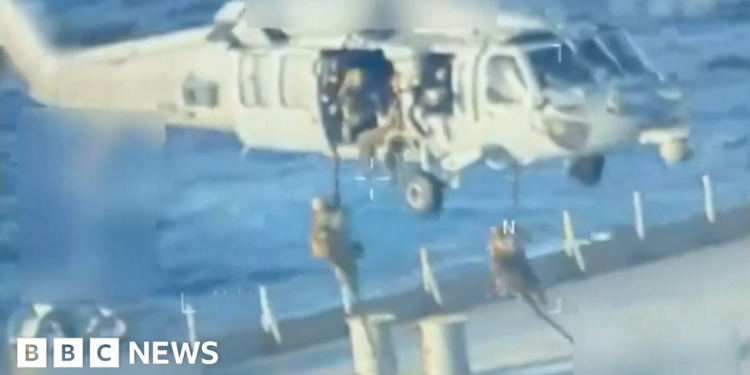 Footage shared by Bondi showed a military helicopter hovering over a large ship, and troops descending on to the deck using ropes. Uniformed men were seen in the clip moving about the ship with guns drawn.