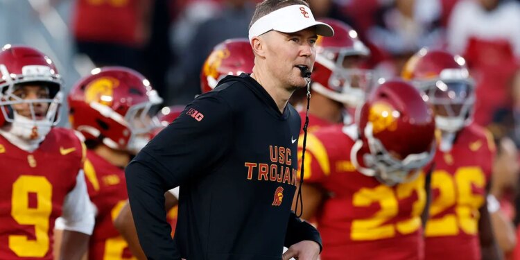 Head coach Lincoln Riley of the USC Trojans looks on prior to a game against the UCLA Bruins at Los Angeles Memorial Coliseum on Nov. 29, 2025, in Los Angeles, California. (Harry How/Getty Images)