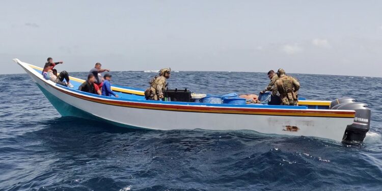 U.S. Coast Guard law enforcement officers embarked aboard HNLMS Friesland (P-842) board a suspected drug smuggling vessel off Acosta, Venezuela, June 30, 2025. The boarding team removed more than 2,300 pounds of illicit drugs worth more than $6 million. (U.S. Coast Guard)