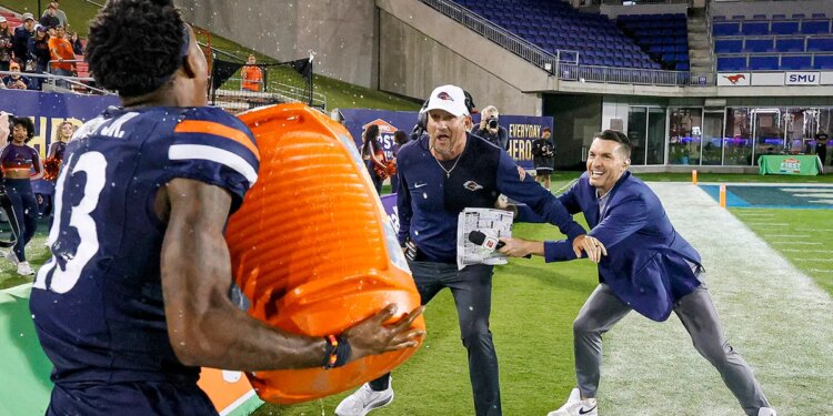 UTSA Roadrunners head coach Jeff Traylor tries to run away from UTSA Roadrunners wide receiver Jamel Hardy (13) to avoid a Gatorade bath after the ServPro First Responder Bowl between the FIU Panthers and the UTSA Roadrunners at Gerald J. Ford Stadium in Dallas, Texas, Dec. 26, 2025. (Matthew Pearce/Icon Sportswire via Getty Images)