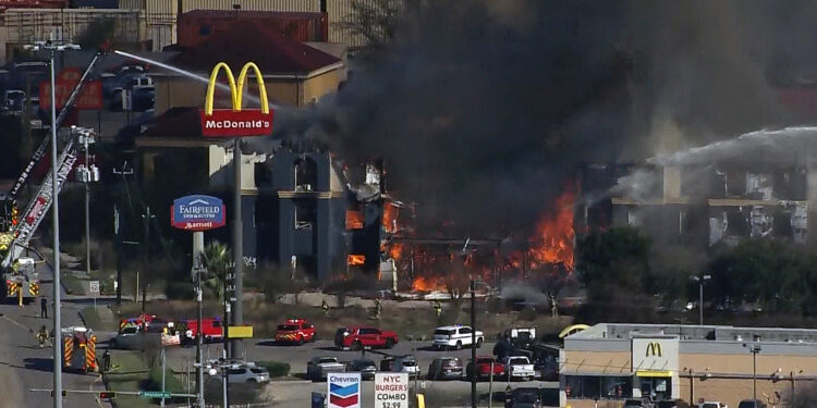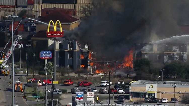 A video feed from Houston TranStar showed a fire consuming the Fairfield Inn & Suites off I-10 East at Sheldon at about 2 p.m. Officials said the hotel was vacant.