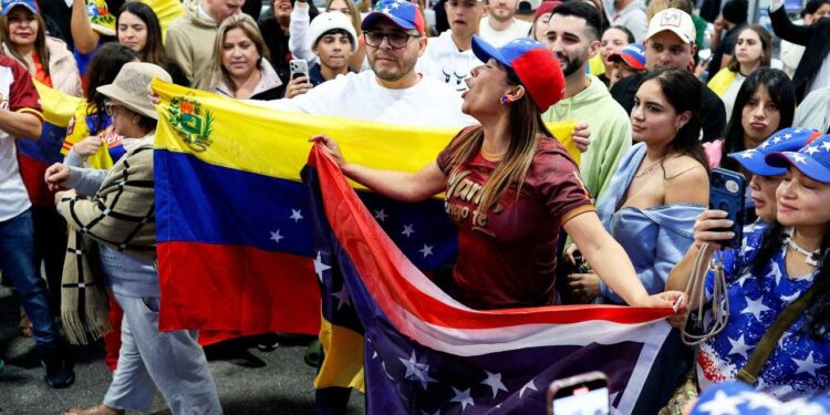 People react to the news of the capture of Venezuelan President Nicolas Maduro, after U.S. military actions in Venezuela Saturday, in Doral, Florida, near Miami on Jan. 3, 2026. (Giorgio Viera / AFP via Getty Images)