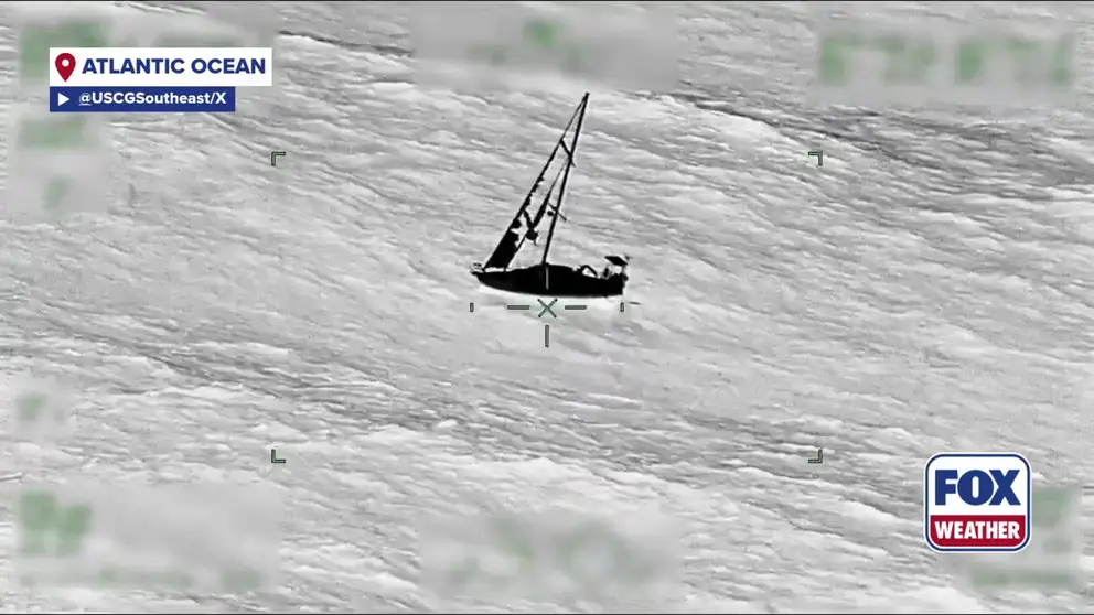 The U.S. Coast Guard Southeast District released video of the rescue, showing the small boat’s tattered sails flying in the wind as the boat was rocked back and forth through the rough waves.