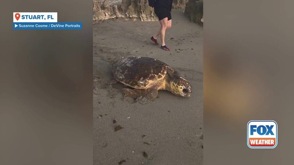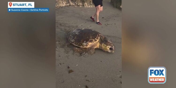 STUART, Fla. – A photographer came upon a startling sight on Wednesday, when she discovered a 300-pound loggerhead turtle wedged between rocks on a southeast Florida beach.