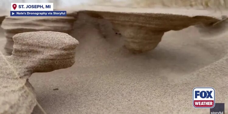 ST. JOSEPH, Mich.– Mini sand sculptures shaped by wind and snow from lake-effect snow bands lined the beach in St. Joseph, Michigan, on Wednesday.