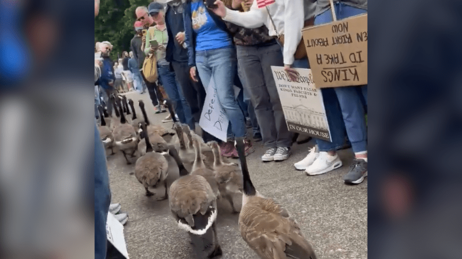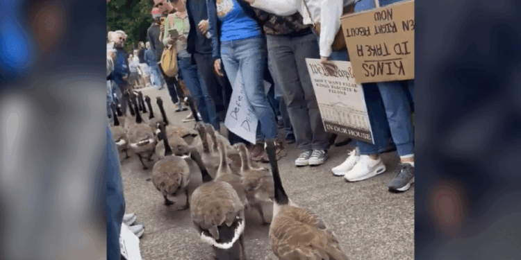 Video posted on social media shows a gaggle of geese wandering through one of the many “No Kings” protests that took place on Saturday in Los Angeles and across America.
