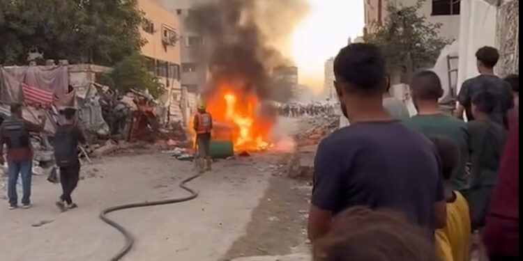 An Israeli strike targeted a vehicle carrying displaced Palestinians who were evacuating Gaza City to the south under Israeli forced displacement orders on Tuesday. Injured women and children were filmed being carried away from the burning car, while authorities said multiple people were killed.