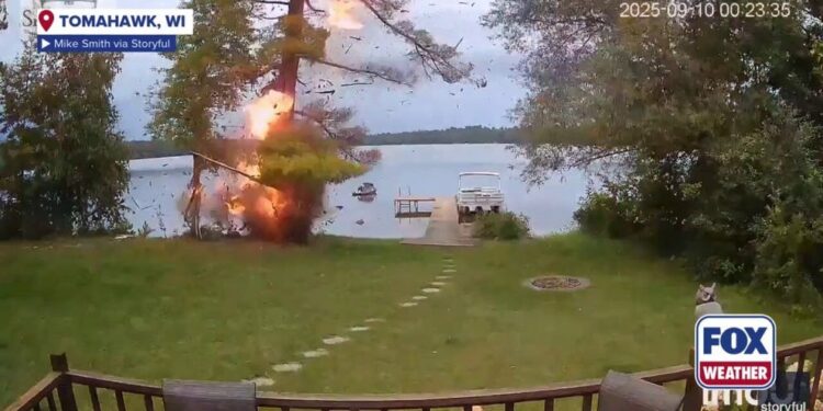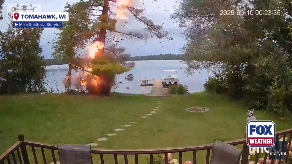 TOMAHAWK, Wis. – The dramatic moment a lightning bolt hit a tree in a Wisconsin backyard, sending bits flying and starting a fire, was caught on camera Tuesday.
