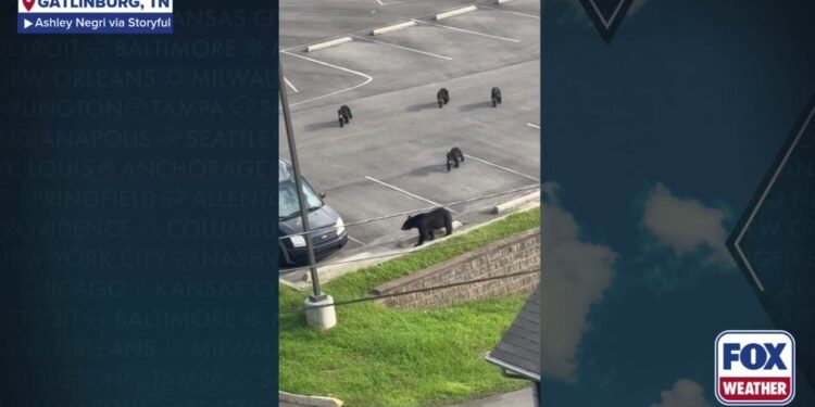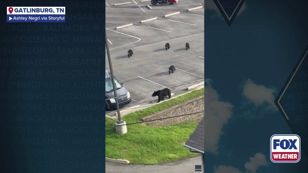 A mother bear and her four cubs cross a parking lot in Gatlinburg.