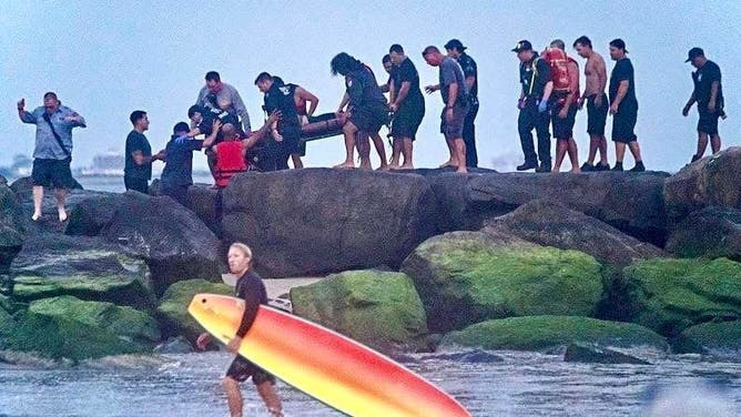 A man and woman were initially spotted being quickly pulled out into the water and toward the tip of a jetty, officials said.