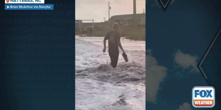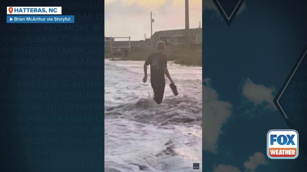 HATTERAS, N.C. – Strong waves from Hurricane Erin knocked a North Carolina man off his feet on Wednesday as he filmed the impacts of the storm in Hatteras.