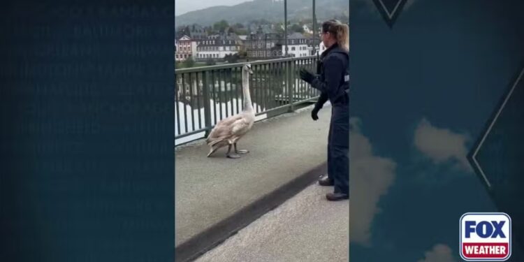 BERNKASTEL-KUES, Germany – A police officer in Germany was brave enough to face an irate swan at risk of being hit by cars on a busy road.