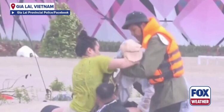 GIA LAI PROVINCE, Vietnam – Vietnamese provincial police have released video of an officer saving a baby and mother from deadly flooding caused by unrelenting rain across the country’s central highlands that has claimed at least 41 lives.