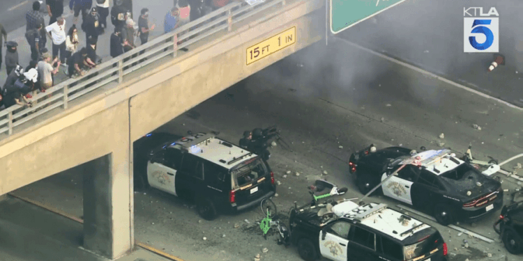 Video: Protesters throw rocks at CHP officers from L.A. freeway bridge