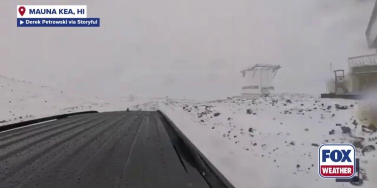 HAWAII VOLCANOES NATIONAL PARK, Hawaii – Snow coated the roads on Mauna Kea, a dormant volcano on Hawaii‘s Big Island Monday, as a storm known as a Kona Low dumped inches of snow across higher elevations.