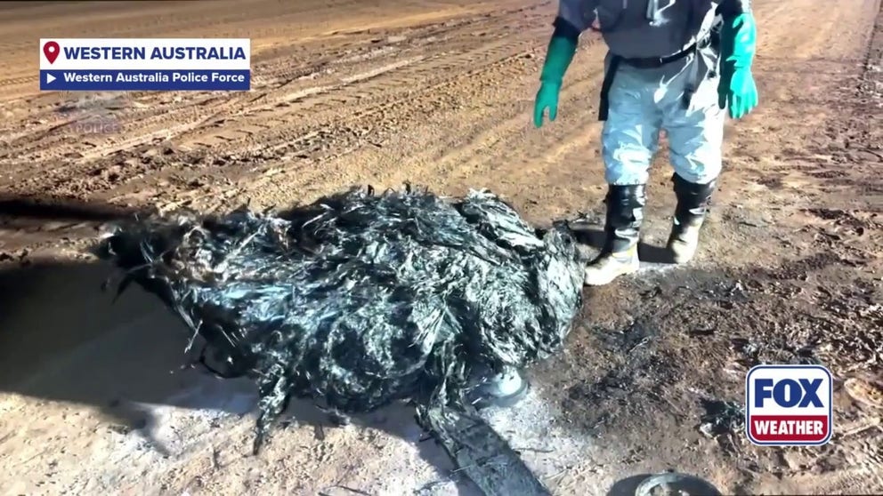Video from Saturday, Oct. 18, shows a hunk of melted, steaming debris in the middle of a dirt area in the Pilbara District of Western Australia. Officials suspect it to be a piece of space junk.
