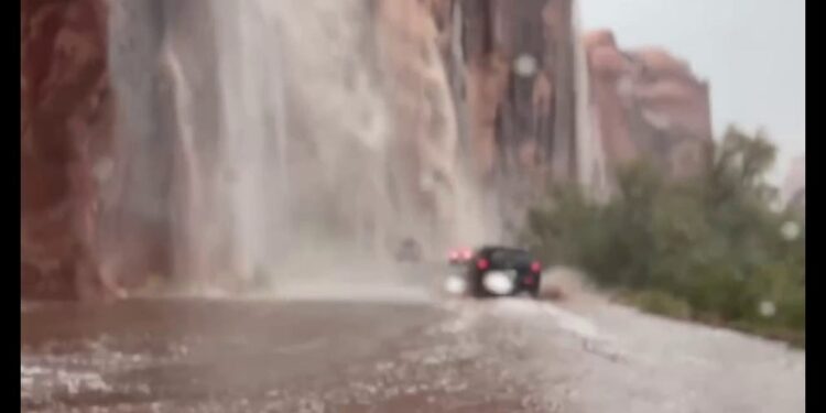 VIDEO: Travelers in Utah fearlessly drive through waterfalls caused by flash flooding
