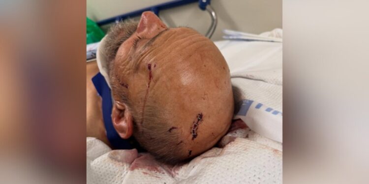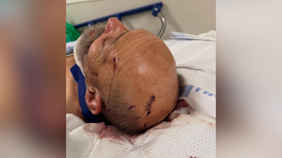 In a photo provided to KTLA by the male victim’s son, his father can be seen in the hospital with at least four staples over a large gash on his head, as well as blood coming from a wound over his left eye. He also appeared to be wearing a neck brace.