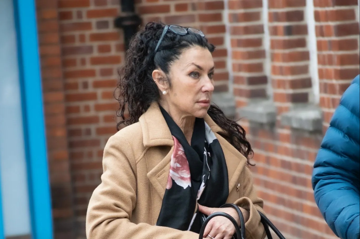 Baker wore a long beige coat, black trousers, and black high-heeled shoes to court.