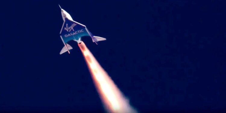Virgin Galactic’s spaceplane fires its rocket engine as it climbs toward the edge of space during a suborbital flight. (Virgin Galactic)