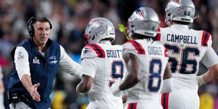 New England Patriots head coach Mike Vrabel celebrates with members of his team after a touchdown during the second half of the NFL Super Bowl LX football game against the Seattle Seahawks, Sunday, Feb. 8, 2026, in Santa Clara, California. (Lynne Sladky/AP)