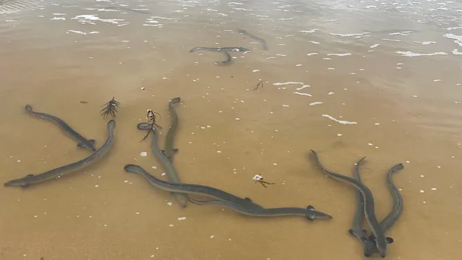 Hundreds of short-finned eels put on a wild, wiggly show on an Australian beach in the city of Warrnambool in Victoria ahead of a daunting migration journey.