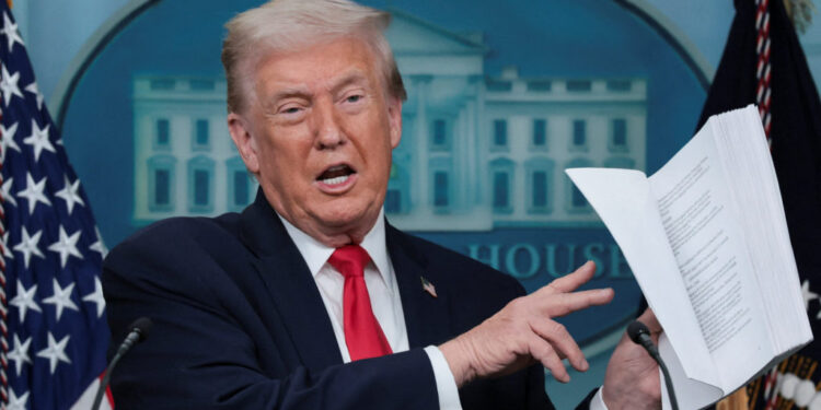 Entering the briefing room with a thick stack of papers, Trump said that he had in his first year back in the White House had “done more than any other administration has done by far.”