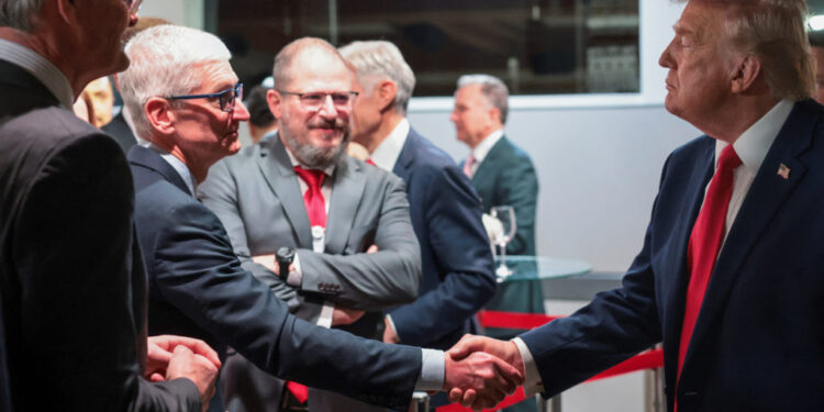 President Donald Trump shakes hands with Apple CEO Tim Cook during a reception with business leaders, at the 56th annual World Economic Forum, in Davos, Switzerland, Jan. 21, 2026. Photo by Jonathan Ernst/Reuters