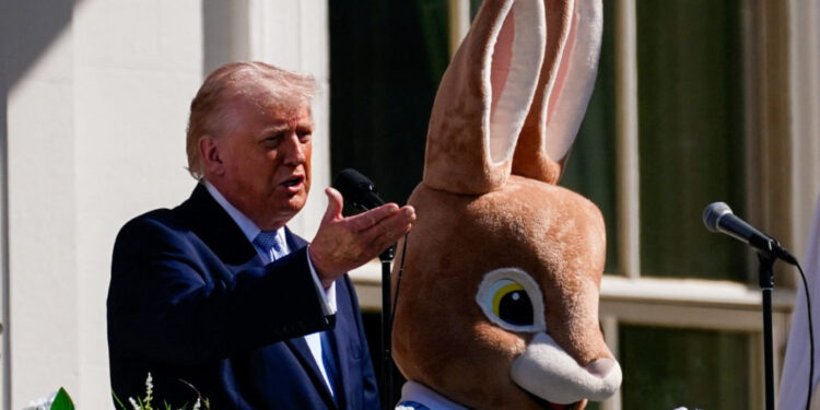 In a surreal scene on the White House lawn with flowers and Easter décor, President Donald Trump decided to give reporters an update on the Iran war.
